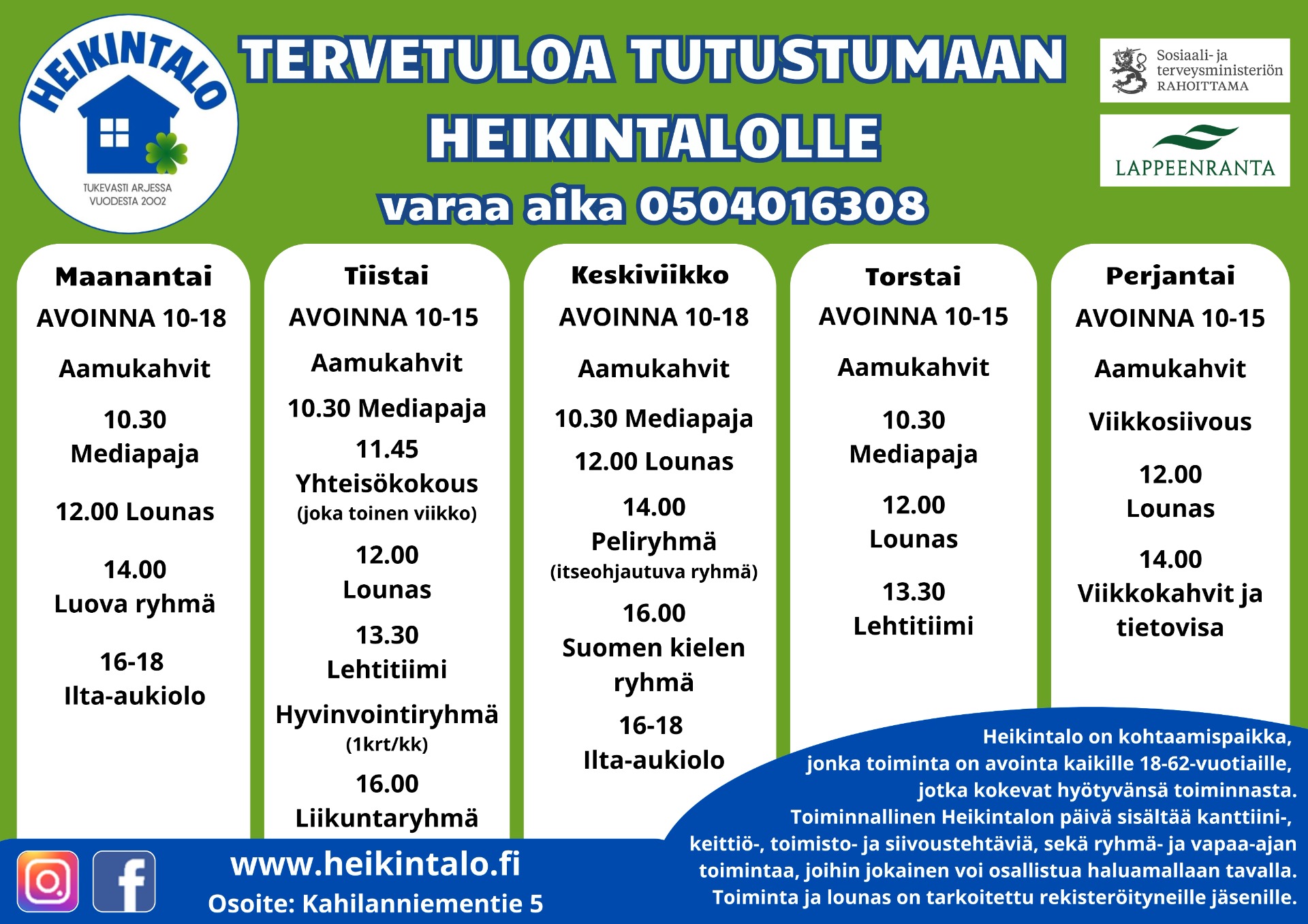 Heikintalo on kohtaamispaikka, jossa toimintaan osallistujilla on mahdollisuus viettää aikaa ja tutustua uusiin ihmisiin sekä osallistua toiminnan suunnitteluun.