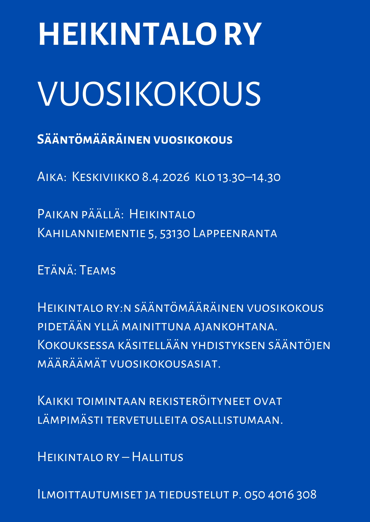Heikintalo ry on itsenäinen, yleishyödyllinen ja voittoa tavoittelematon yhdistys.