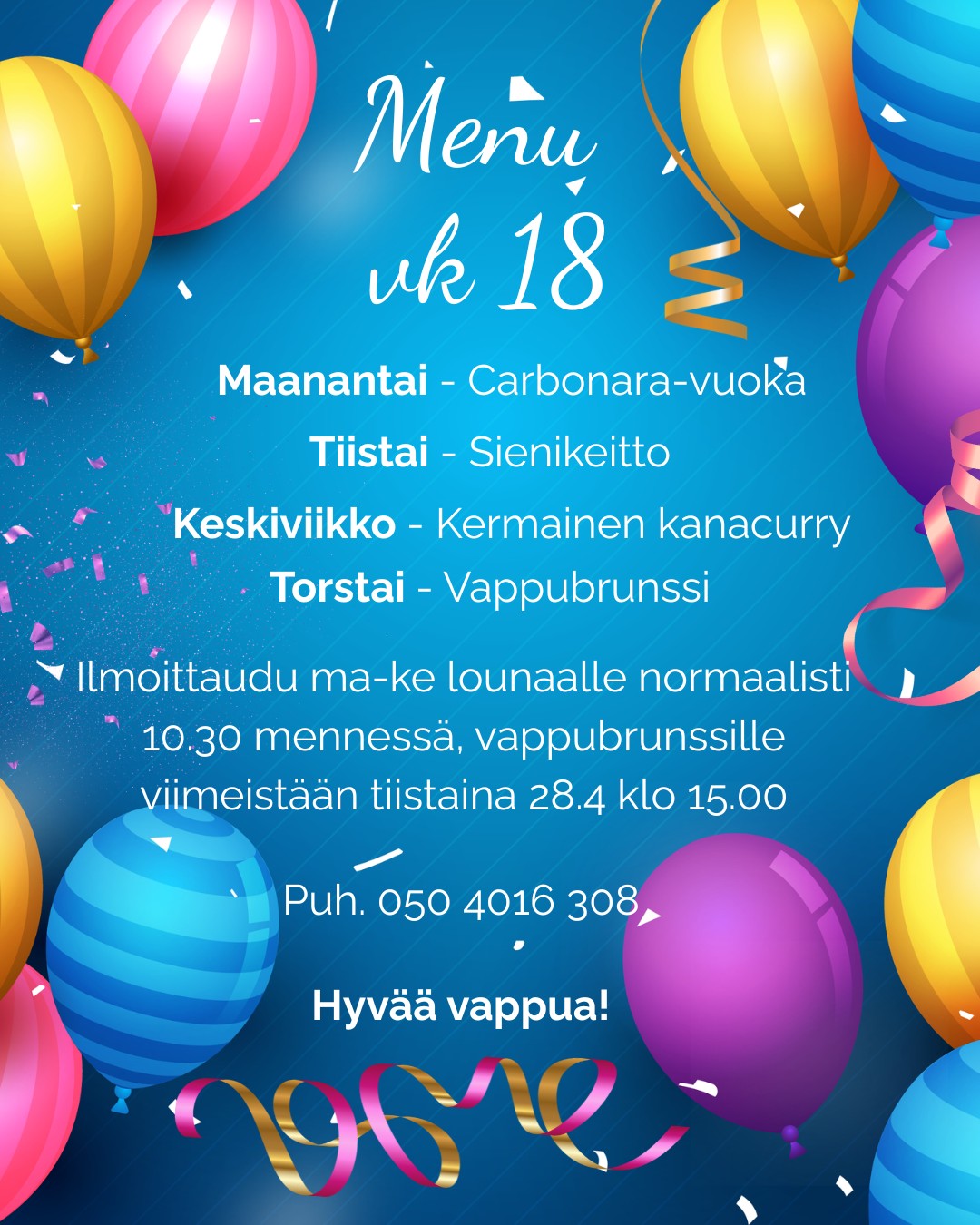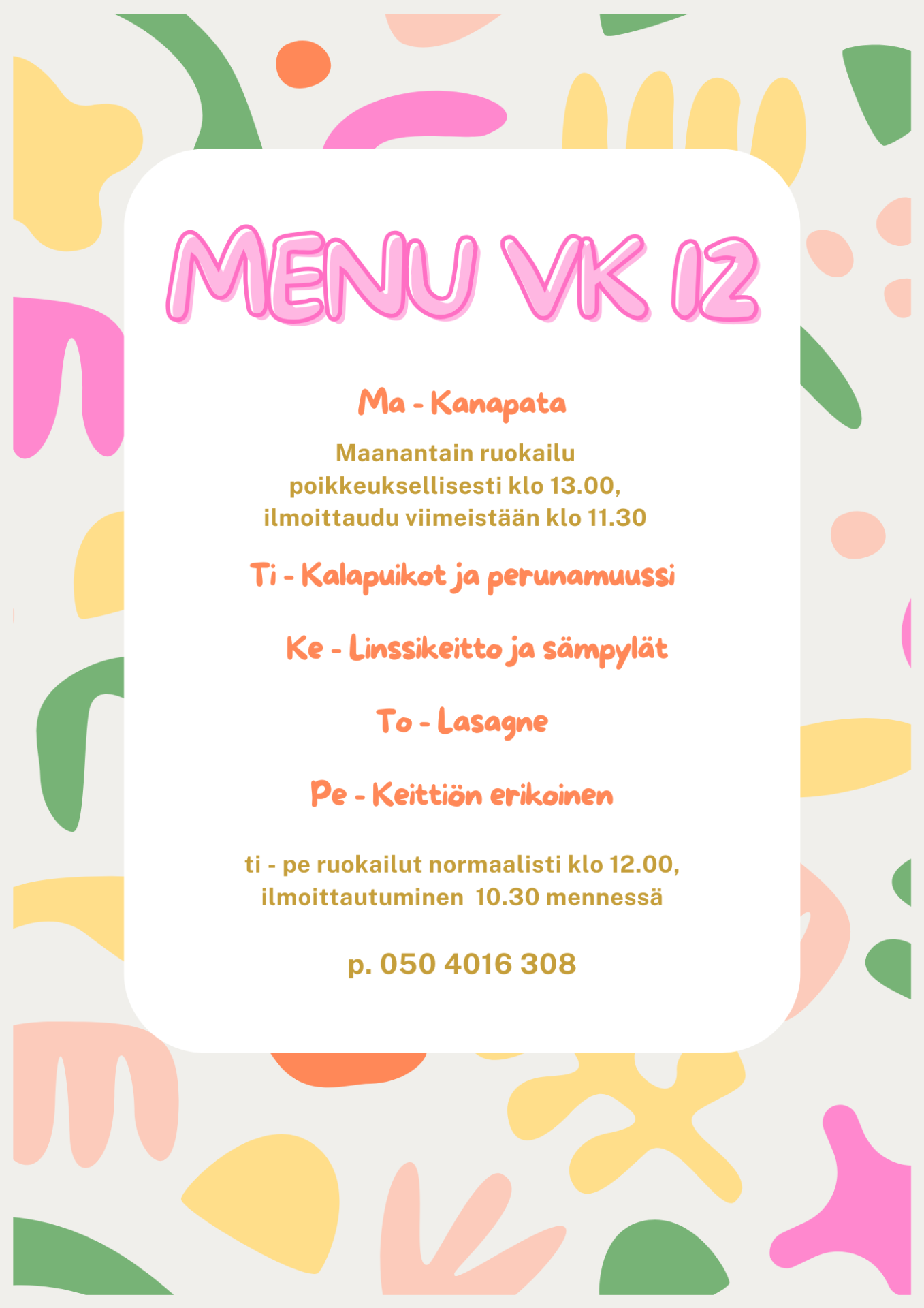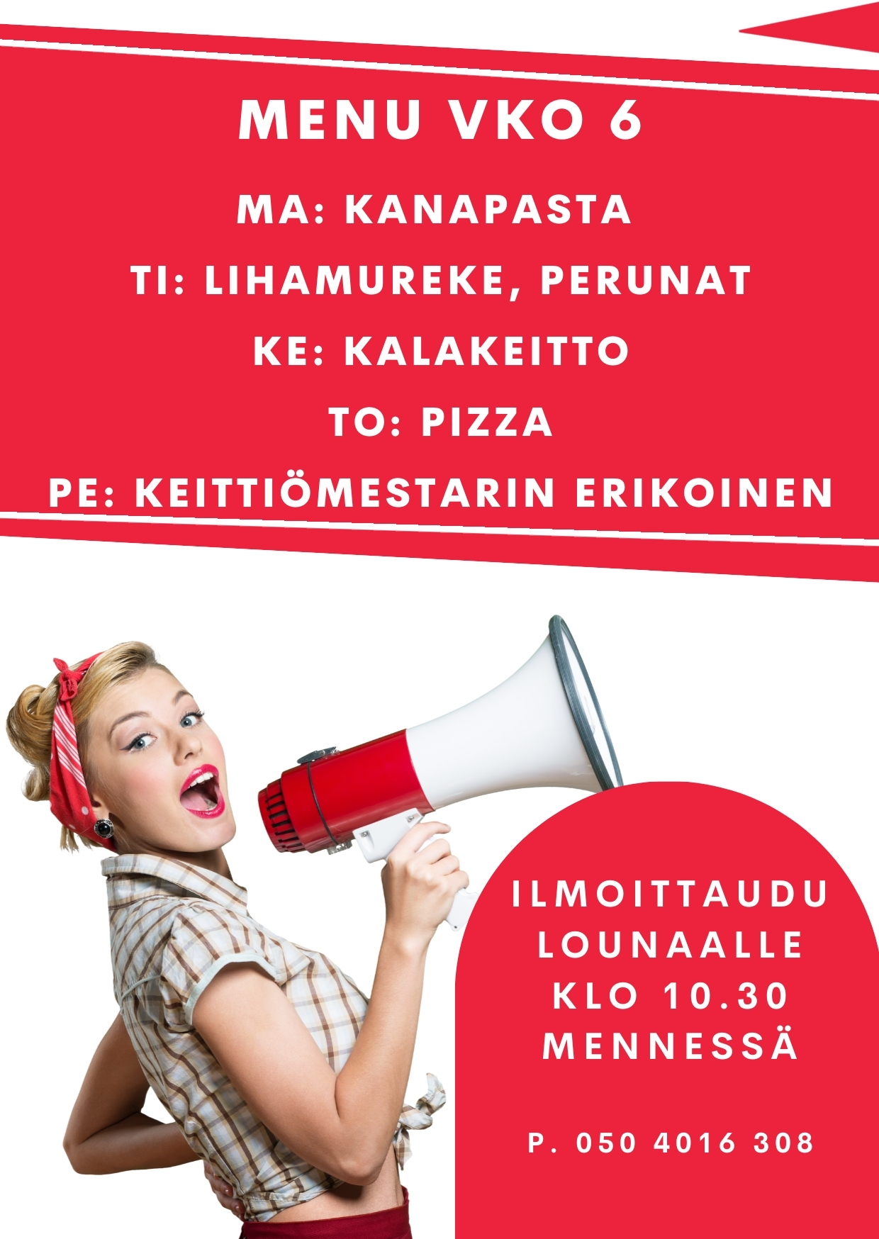 Lounas on klo 12.00. Ilmoittautuminen lounaalle klo 10.30 mennessä p. 050 4016 308.